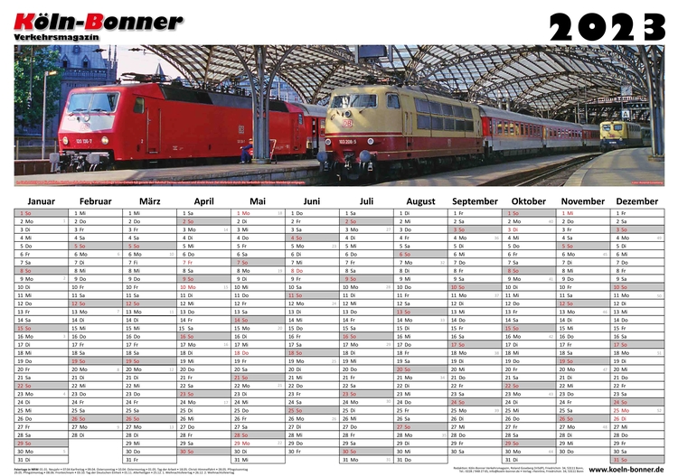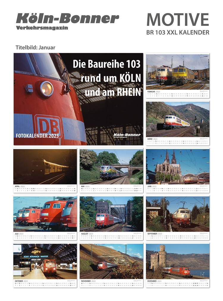 Zum zweiten Mal wird es für 2023 einen Kalender mit unveröffentlichten Betriebs- und Streckenaufnahmen der legendären Baureihe 103 aus ihren letzten Einsatzjahren rund um Köln und entlang des Mittelrheintals geben. Der Hochglanzkalender im großen DIN A2-Format (59,4 x 42 cm) ist ab Ende September 2022 zum Preis von 34,80 € (zzgl. 4,80 € Porto und Versand) erhältlich. Einzelpreis 34,80 € zzgl. 4,80 € Versand.